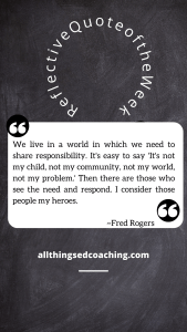 The beginning of the school year came with many promises for change. Changes to the system to be more inclusive, focus on mental health, social/emotional learning, learning loss, and equity. As the year progressed, it seemed that the system slowly (or not so slowly) went back to it’s previous flow with little to no real change. This year, I am part of the Educators Neighborhood Cohort with the Fred Rogers Institute. (I’ll write more on that later, when my time in this cohort culminates in July.) For this week’s quote to reflect upon, I choose the following statement from Mr. Rogers. “We live in a world in which we need to share responsibility. It’s easy to say ‘It’s not my child, not my community, not my world, not my problem.’ Then there are those who see the need and respond. I consider those people my heroes.”