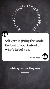 It’s getting close to the end of the school year here on the east coast, with about 10 days to go! As we get closer the amount of paperwork, planning, and preparation mounts higher. Taking a moment for yourself to regroup may be needed and that’s OK. This week’s reflection is about self-care. “Self-care is giving the world the best of you, instead of what’s left of you.” What will you do this week for yourself?