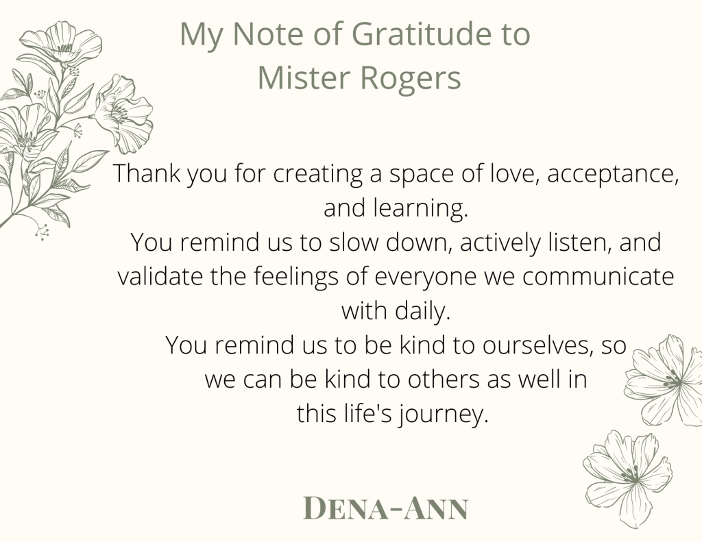 After spending a year diving into episodes and having productive conversations around the work of Fred Rogers, I found the last whole group convening challenging at the end. It was a culmination of all the conversations and work we did within our individual buildings and classrooms to spread kindness and understanding to young children, educators, and even ourselves. There was a lot of reflection and yes, maybe some tears that this wonderful journey was coming to a close. Two reflective practices that we completed during our last convening was to reflect upon one thing that we took away from this experience and to write a note of gratitude to Mr. Rogers. What I took away from this experience was that we are not alone in this important work. At times, we may feel alone in our situations and struggle to do what is right for all (our students~our staff ~ourselves) but there is comfort in knowing that others are doing the same work. Others are looking for the answers to solve some difficult issues, finding ways to incorporate social-emotional learning and trauma-informed practice within our settings that are also developmentally appropriate. It is not an easy task by any measure and when we have others to assist in our learning and teachings it helps us be the best educators (and humans) we can be.